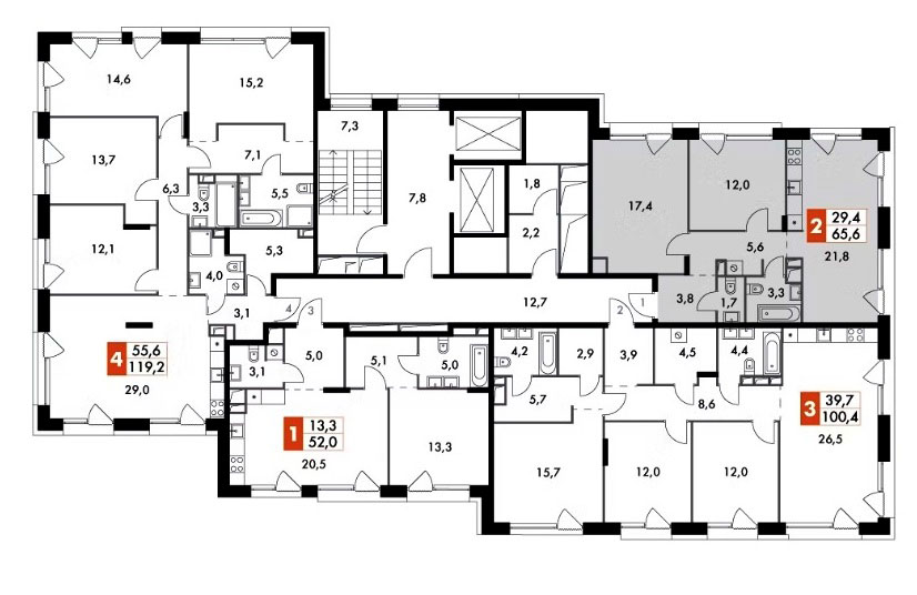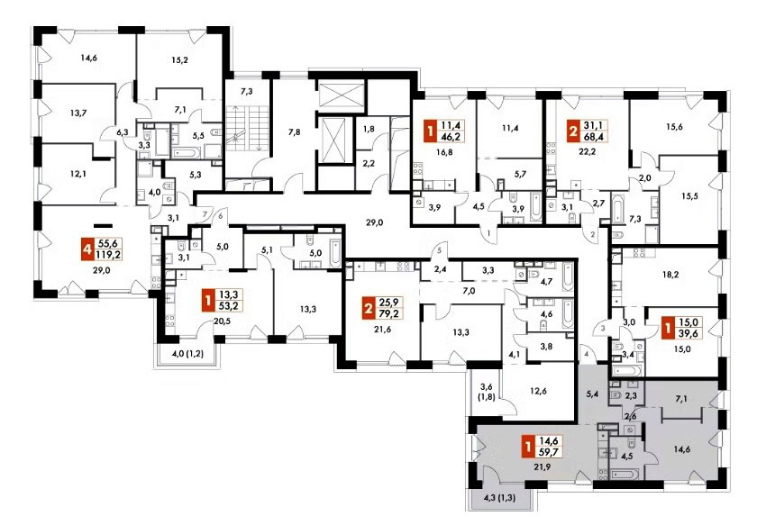 Жилой фонд комплекса включает одно-, двух-, трех-, четырех- и пятикомнатные квартиры площадью от 39,6 до 121,8 кв.м. В том числе: