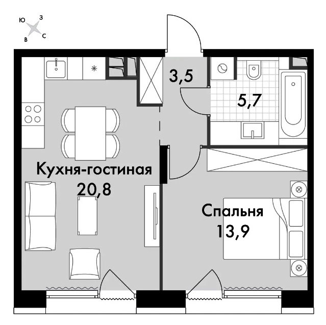 Однокомнатная квартира располагает входной зоной площадью 3,5 кв.м., совмещенным санузлом площадью 5,7 кв.м., кухней-гостиной площадью 20,8 кв.м. и спальней площадью 13,9 кв.м.