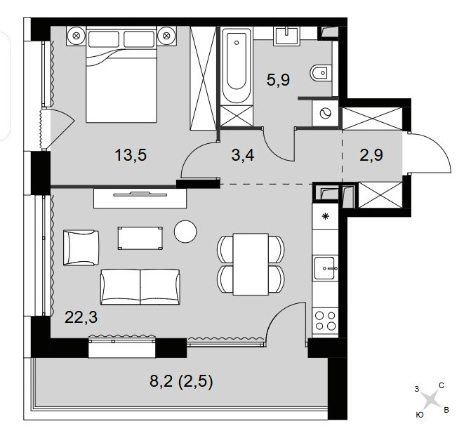 Двухкомнатная квартира евроформата оснащена входной зоной площадью 6,3 кв.м. (с учетом внутреннего коридора), совмещенным санузлом площадью 5,9 кв.м., кухней-гостиной площадью 22,3 кв.м. и спальней площадью 13,5 кв.м. Расположение окон угловое, есть балкон площадью 8,2 кв.м.