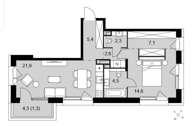 Двухкомнатная квартира в формате «евро» имеет входную зону площадью 8,0 кв.м., два санузла площадью 2,3 и 4,5 кв.м., кухню-гостиную площадью 21,9 кв.м. и мастер-спальню площадью 21,7 кв.м. Есть балкон площадью 4,3 кв.м.
