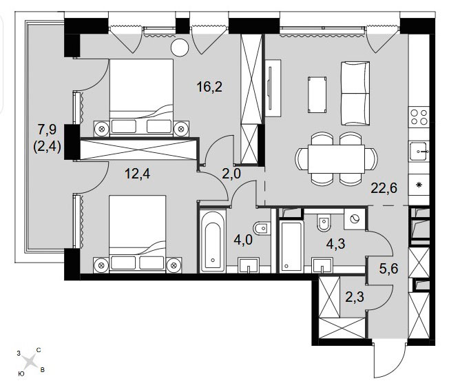 В двухкомнатной квартире классического формата запроектирована входная зона площадью 5,6 кв.м., два санузла с площадью помещений 4,0 и 4,3 кв.м., кухней площадью 22,6 кв.м. и две спальни площадью 12,4 и 16,2 кв.м. есть гардеробная площадью 2,3 кв.м. и балкон площадью 7,9 кв.м. Расположение окон угловое, в одной из спален два окна.