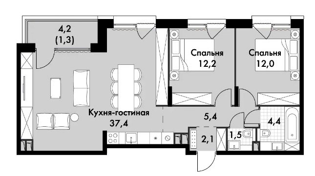 В данной евротрешке есть входная зона площадью 7,5 кв.м., два санузла площадью 1,5 и 4,4 кв.м., кухня-гостиная площадью 37,4 кв.м. и две спальни площадью 12,0 и 12,2 кв.м. Есть балкон площадью 4,2 кв.м. Расположение окон одностороннее.