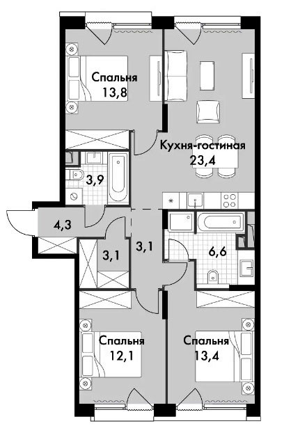 Трехкомнатная квартира запроектирована в классическом варианте. В ней имеются входная зона площадью 7,4 кв.м., два санузла площадью 3,9 и 6,6 кв.м., кухня площадью 23,4 кв.м., и три спальни площадью от 12,1 до 13,8 кв.м. Есть гардеробная площадью 3,1 кв.м. Расположение окон на две стороны.
