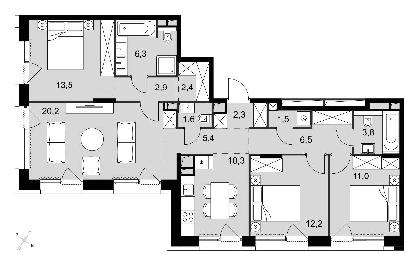 Четырехкомнатная квартира располагает входной зоной площадью 14,2 кв.м. (с учетом внутренних коридоров), тремя санузлами площадью от 1,6 до 6,3 кв.м., кухней площадью 10,3 кв.м. и четырьмя спальнями площадью от 11,0 до 20,2 кв.м. Имеется гардеробная площадью 2,4 кв.м. и постирочная площадью 1,5 кв.м. Одна из спален спроектирована в формате «мастер». Расположение окон угловое, в одной из спален три окна.