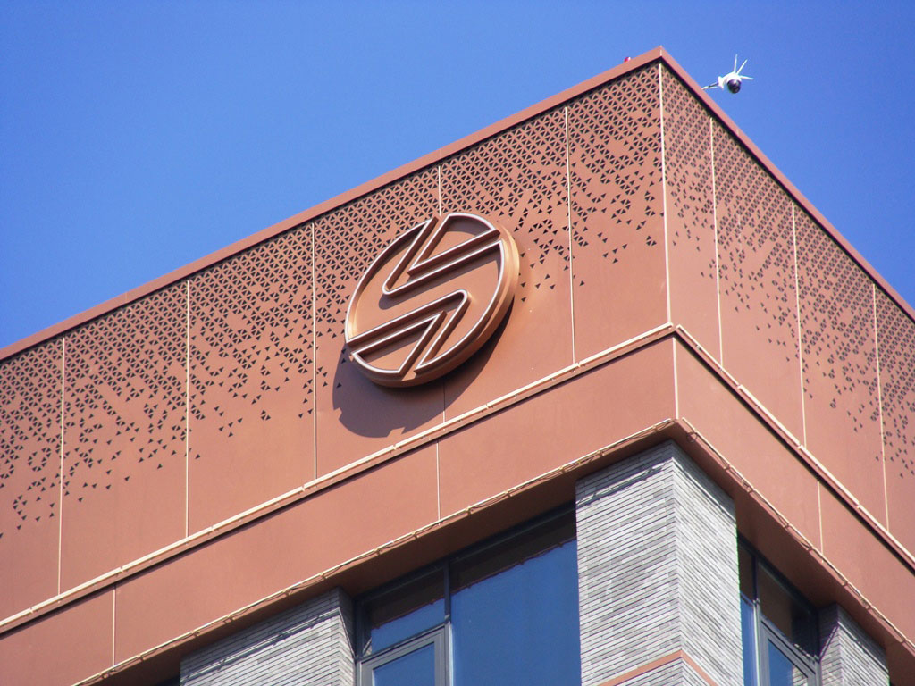 Внешне здание напоминает пирамиду, сужающуюся кверху за счет уменьшения площади этажей. Стены оборудованы утепленным навесным вентилируемым фасадом, облицованным керамическими плитками и фибробетонными панелями.