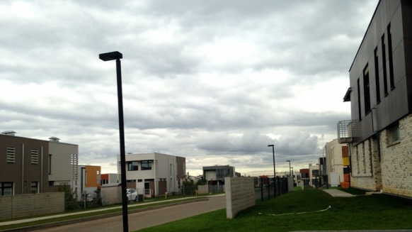 Многие из домов уже заселены, все необходимые инженерные коммуникации проведены, а территория, пока довольно аскетично, но все-таки облагорожена. В принципе, сдержанность благоустройства вполне соответствует колориту поселка. Ну а в сочетании с пасмурной погодой выходит полная гармония.