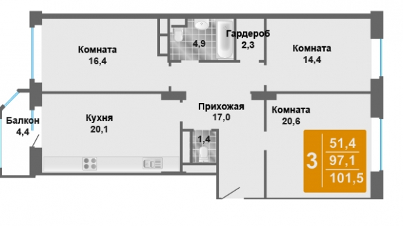 Трехкомнатных планировок – два варианта, и они практически идентичные по площади и расположению комнат. Кстати, решение сделать кухню двадцатиметровой устроит не каждого, но в принципе, можно поменять местами кухню и маленькую комнату – расположение санузлов позволяет.
