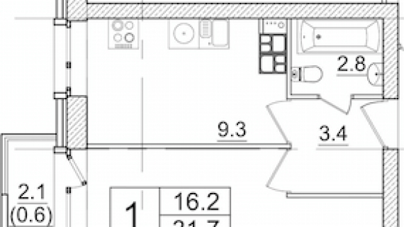 Проектировщики явно сделали ставку на одно- и двухкомнатные квартиры, их на чертежах больше всего. Причём есть и классические, и европейские варианты с большой столовой и отдельной спальней. Открывается ассортимент с площади в 31 метр, где на небольшом пространстве смогли уместить и 9-метровую кухню, и 16-метровую гостиную.