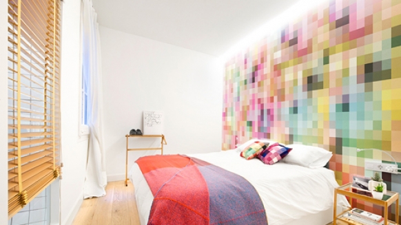 Не используйте яркие цвета на очень больших поверхностях. Например, не стоит выкрашивать все стены в комнате в насыщенный оттенок. Лучше разбавить его за счет рисунка с использованием более светлых тонов. И выкрасить или оклеить обоями только одну стену или ее часть, а яркости добавить аксессуарами. Как на фотографии ниже.