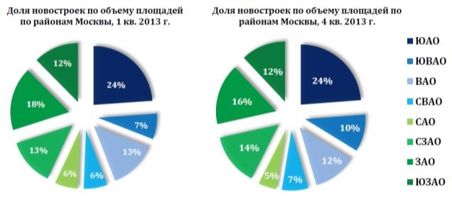 По объему площадей (в кв. метрах) с результатом в 24% ЮАО прочно занимает первое место (без учета новостроек ЦАО), при этом, по данным «Бест Новострой», этот результат данный округ удерживал весь год.