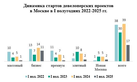 В I полугодии 2025 года московские девелоперы начали реализацию 17[1] проектов жилой застройки, подсчитали аналитики компании «Метриум». Относительно аналогичного периода 2024 года показатель снизился на 56,4%. Наиболее активно новые проекты запускали девелоперы новостроек бизнес-класса (11 комплексов).