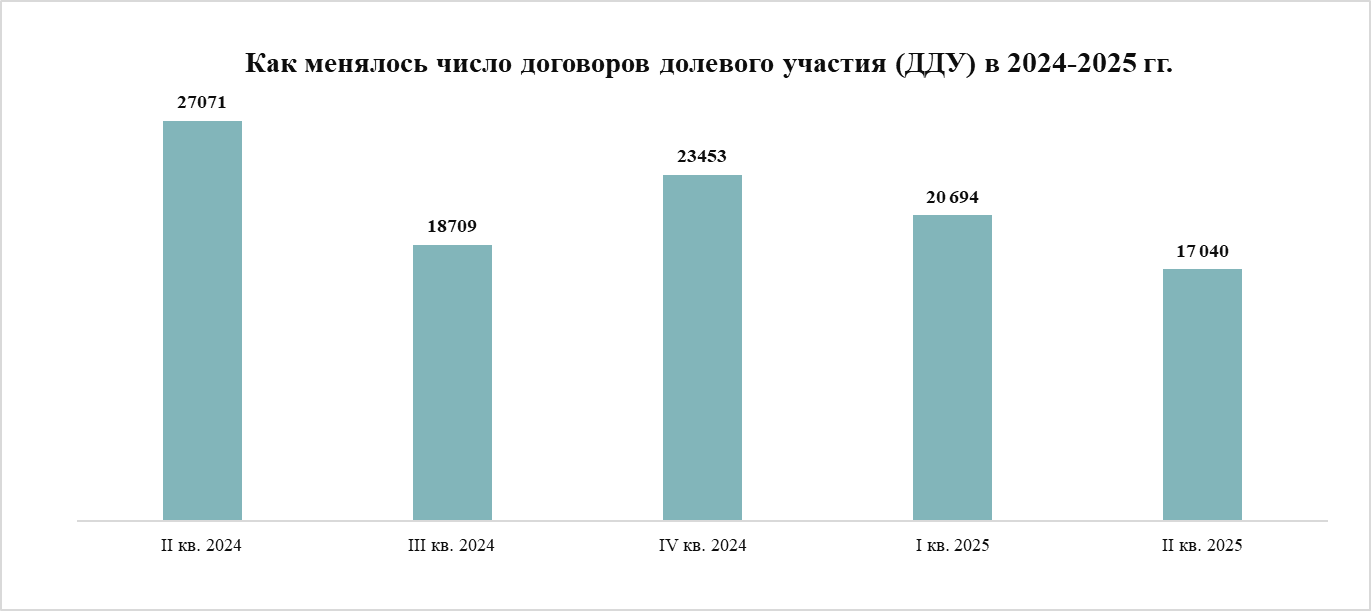 В июне 2025 года, согласно данным Росреестра Москвы, на рынке строящегося жилья было зарегистрировано 5,4 тыс. договоров долевого участия (ДДУ), что на 48% меньше, чем в июне 2024 года, когда было зафиксировано 10,5 тыс. ДДУ. Тем не менее относительно мая 2025 года (5,0 тыс. ДДУ) наблюдался небольшой рост на 8%.