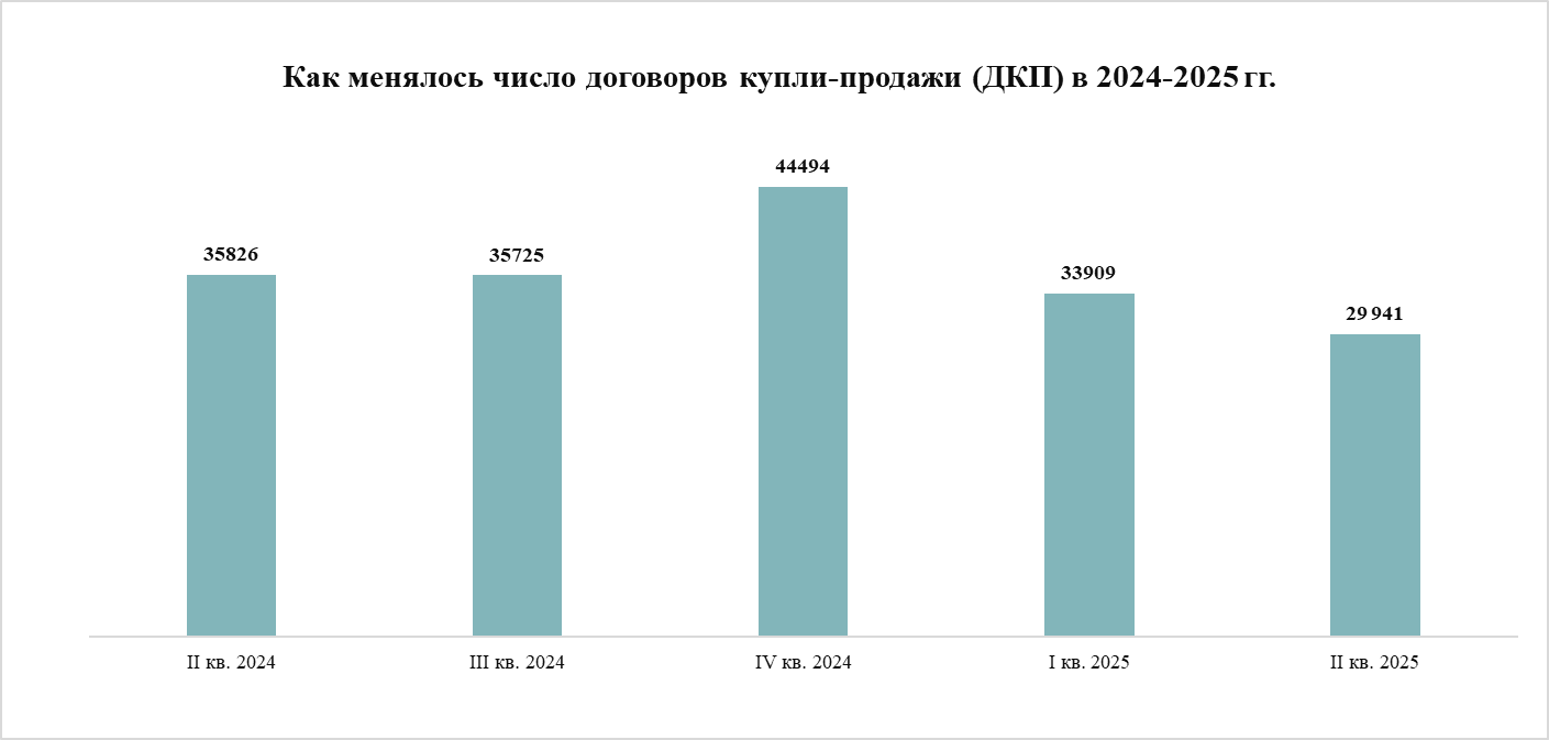 По итогам первого полугодия 2025 года общее число сделок купли-продажи составило 63,9 тыс., что на 3% меньше показателя за аналогичный период 2024 года (66,0 тыс.). Снижение по итогам полугодия обусловлено резким спадом активности во втором квартале (-16% к прошлому году), который нивелировал позитивные результаты первого квартала (тогда рост составил 12%).