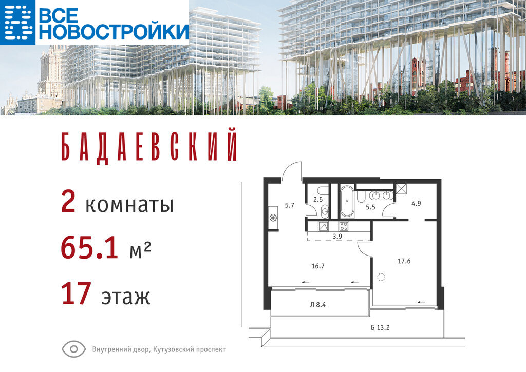 Продаётся 2-комнатная квартира общей площадью 65,10 м² на 17 этаже Жилого Комплекса Бадаевский.