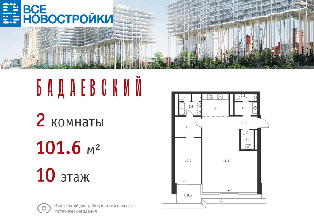 Расположение в начале Кутузовского проспекта делает проект не только престижным, но и удобным: до Третьего транспортного и Садового кольца можно доехать за 5 минут, а Кремль и основные исторические достопримечательности расположены в 15 минутах на автомобиле. Напротив «Бадаевского» находится офисный кластер «Москва-Сити».