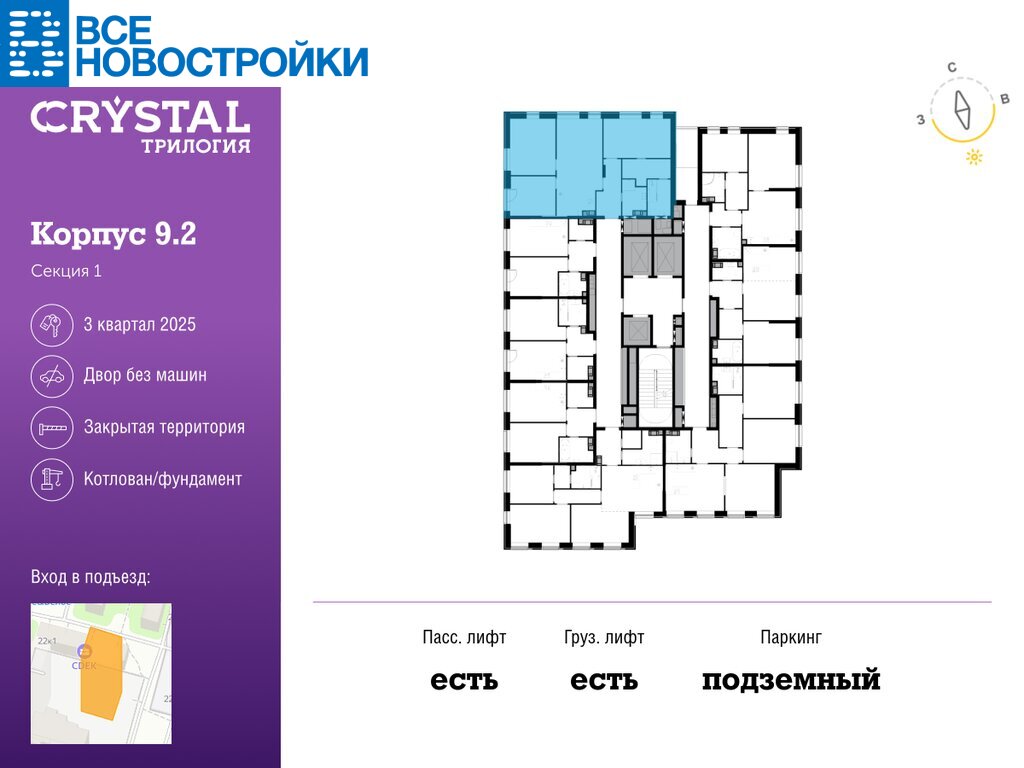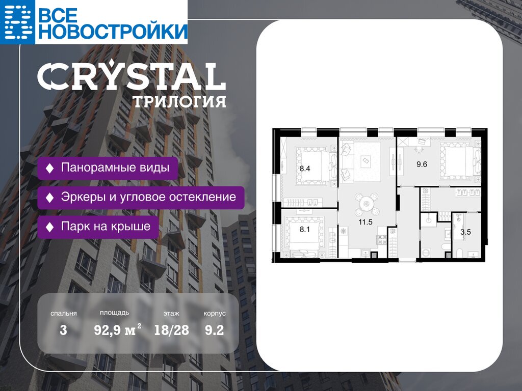 Продается трекомнатная квартира площадью 92.90 кв. м в жилом комплексе бизнес-класса «CRYSTAL Трилогия» от девелопера «КРОСТ». Квартира расположена на 18 этаже корпуса 9.2.