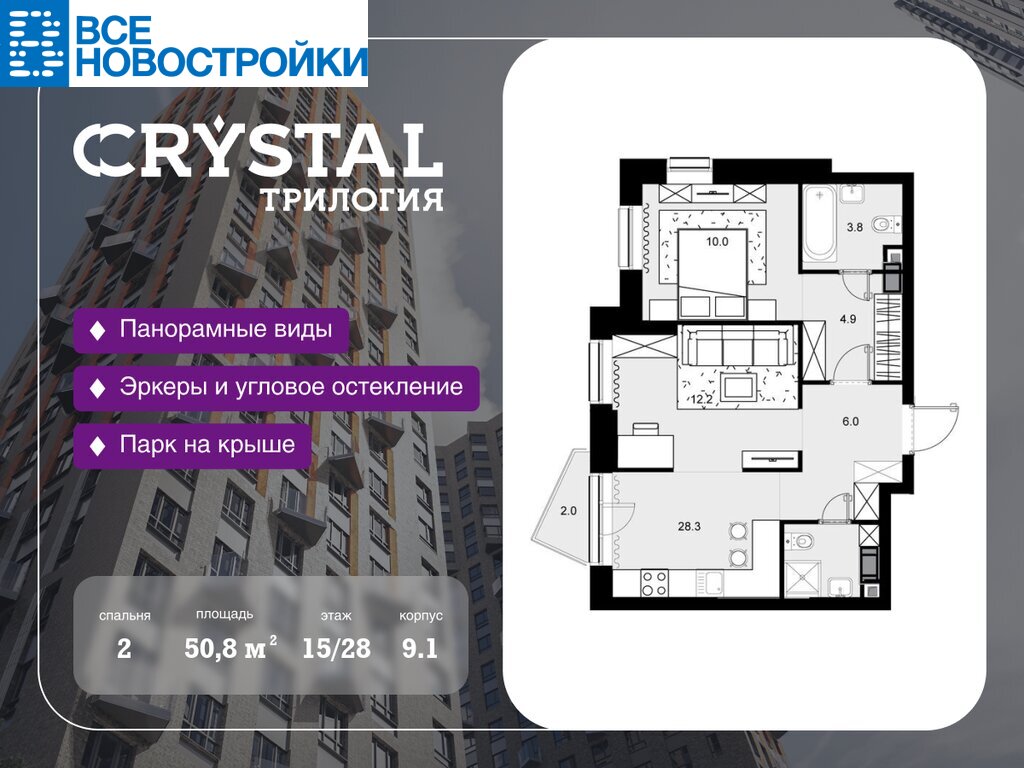 Продается двухкомнатная квартира площадью 50.80 кв. м в жилом комплексе бизнес-класса «CRYSTAL Трилогия» от девелопера «КРОСТ». Квартира расположена на 15 этаже корпуса 9.1.