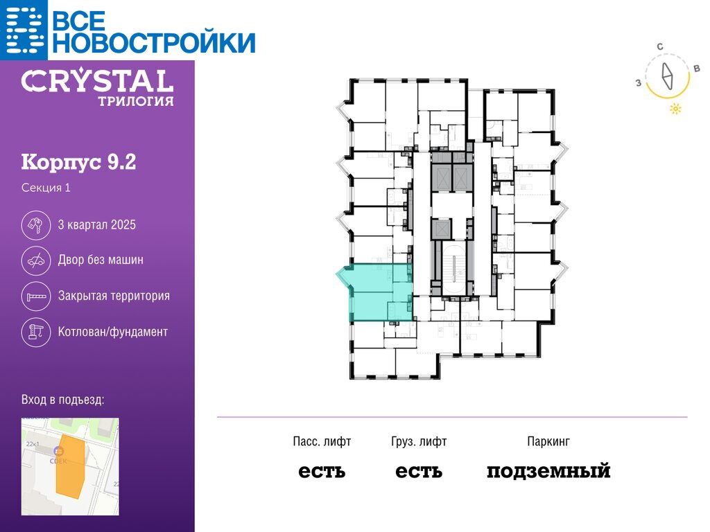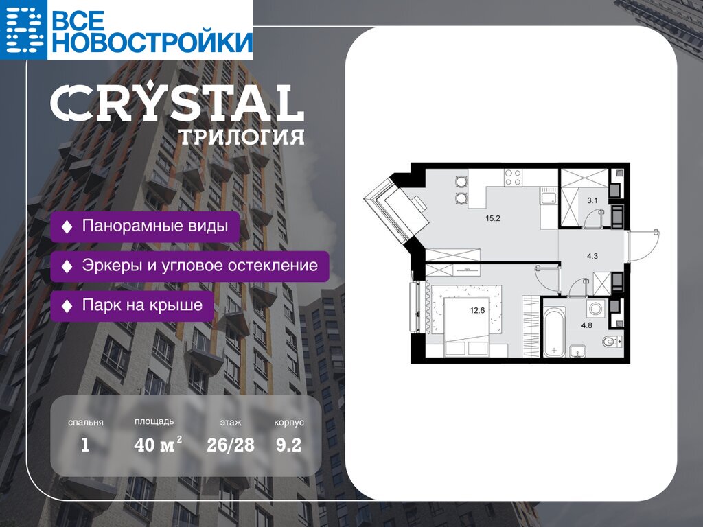 Продается однокомнатная квартира площадью 40.00 кв. м в жилом комплексе бизнес-класса «CRYSTAL Трилогия» от девелопера «КРОСТ». Квартира расположена на 26 этаже корпуса 9.2.