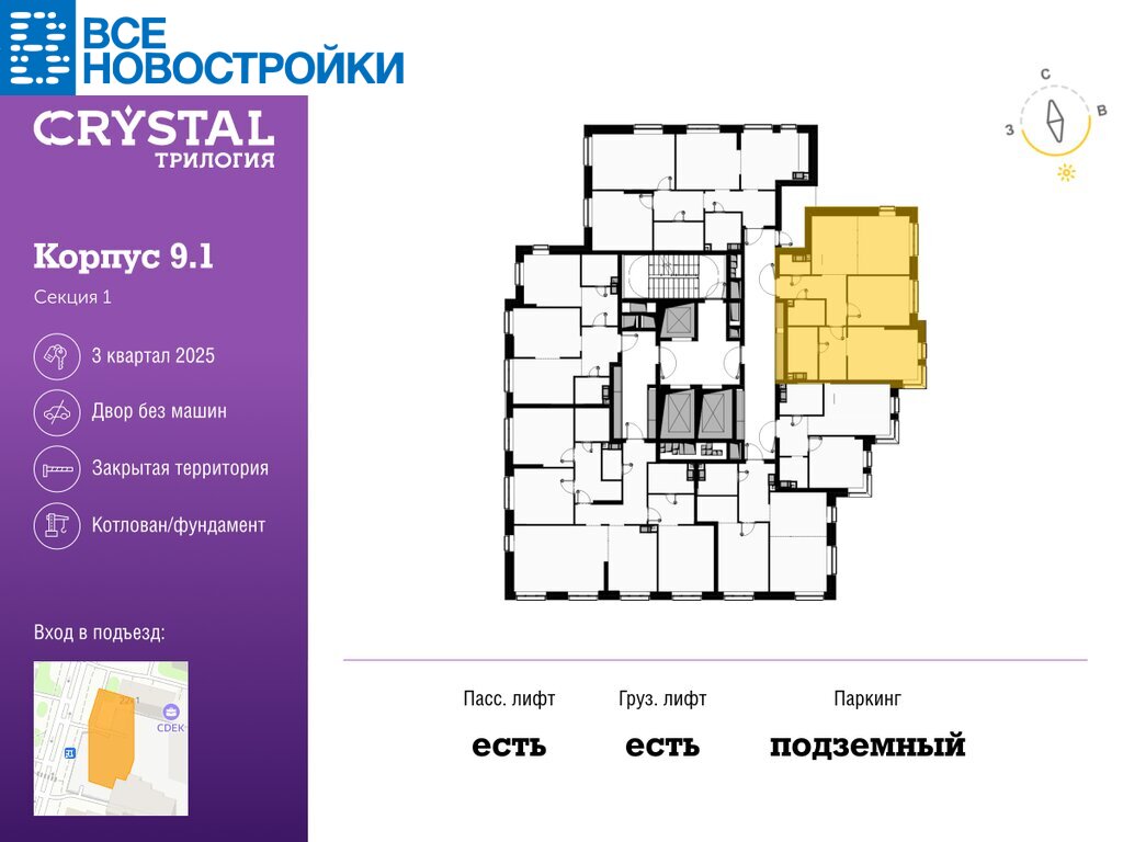 Продается двухкомнатная квартира площадью 67.60 кв. м в жилом комплексе бизнес-класса «CRYSTAL Трилогия» от девелопера «КРОСТ». Квартира расположена на 27 этаже корпуса 9.1.