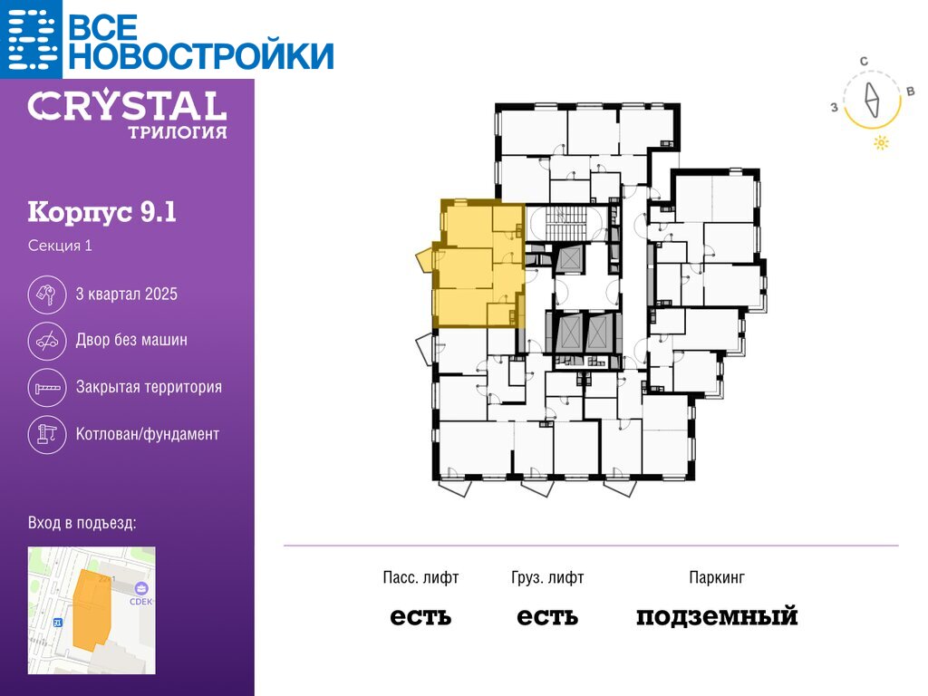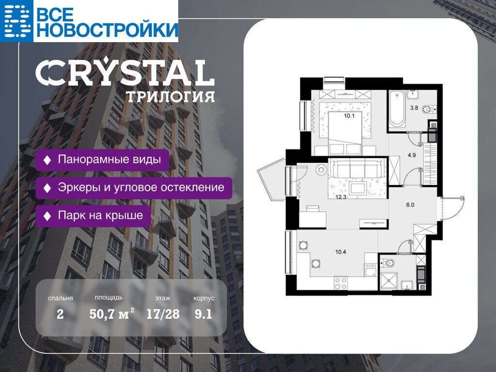Продается двухкомнатная квартира площадью 50.70 кв. м в жилом комплексе бизнес-класса «CRYSTAL Трилогия» от девелопера «КРОСТ». Квартира расположена на 17 этаже корпуса 9.1.