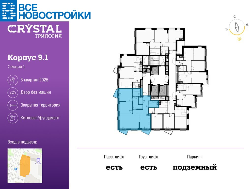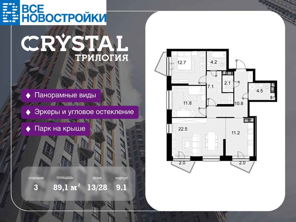Продается трекомнатная квартира площадью 89.10 кв. м в жилом комплексе бизнес-класса «CRYSTAL Трилогия» от девелопера «КРОСТ». Квартира расположена на 13 этаже корпуса 9.1.