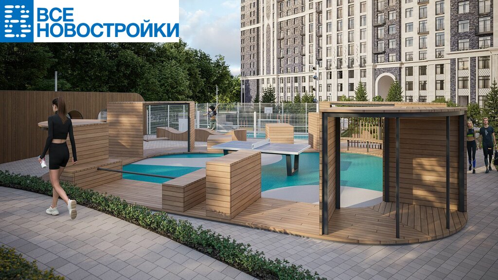 В центральной части двора расположен амфитеатр со сценой для представлений и проведения мероприятий. Для гармоничного развития маленьких жителей — пространства по стандарту Kid`s Lab для гармоничного развития детей всех возрастов: детская площадка, игровая комната, рельефная площадка для общения со сверстниками, где можно заниматься паркуром, танцевать и играть в настольный теннис.