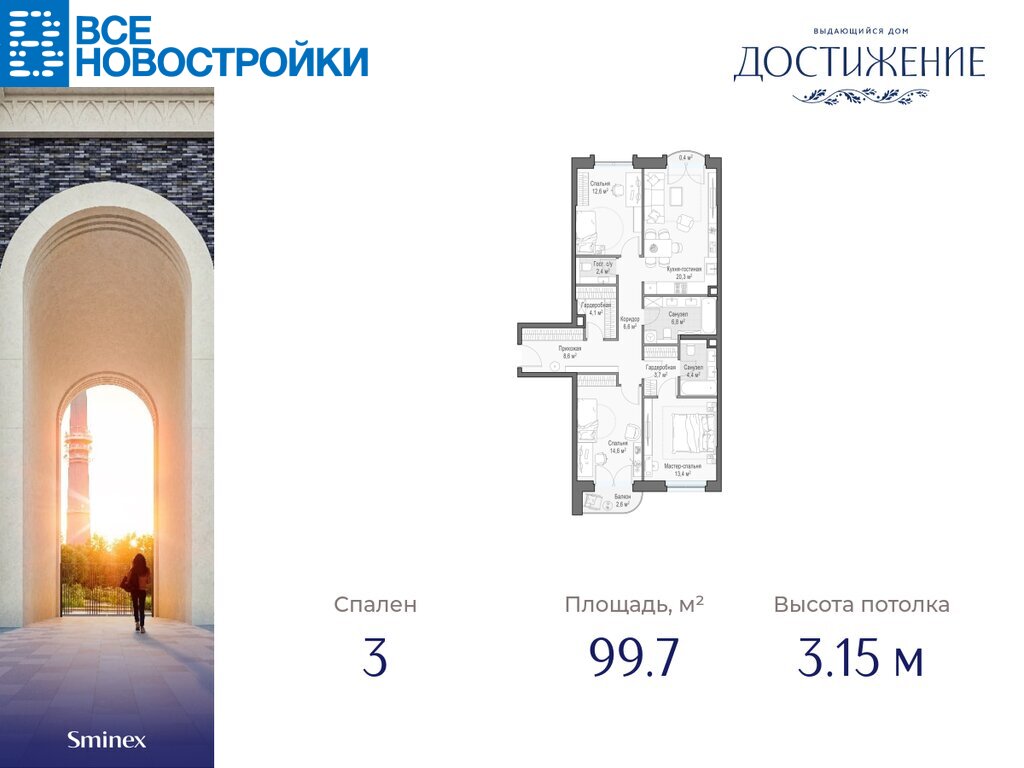 Трёхспальная квартира с тремя балконами. Просторная кухня-гостиная c видом на Останкинскую телебашню. Окна двух спален выходят на запад, что позволит наслаждаться закатом и любоваться огнями ночного города.