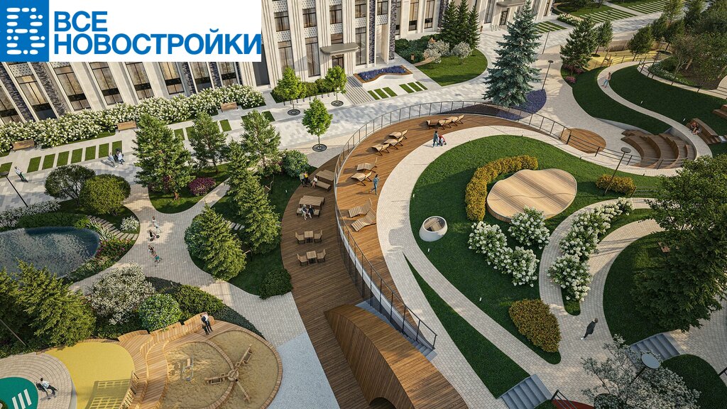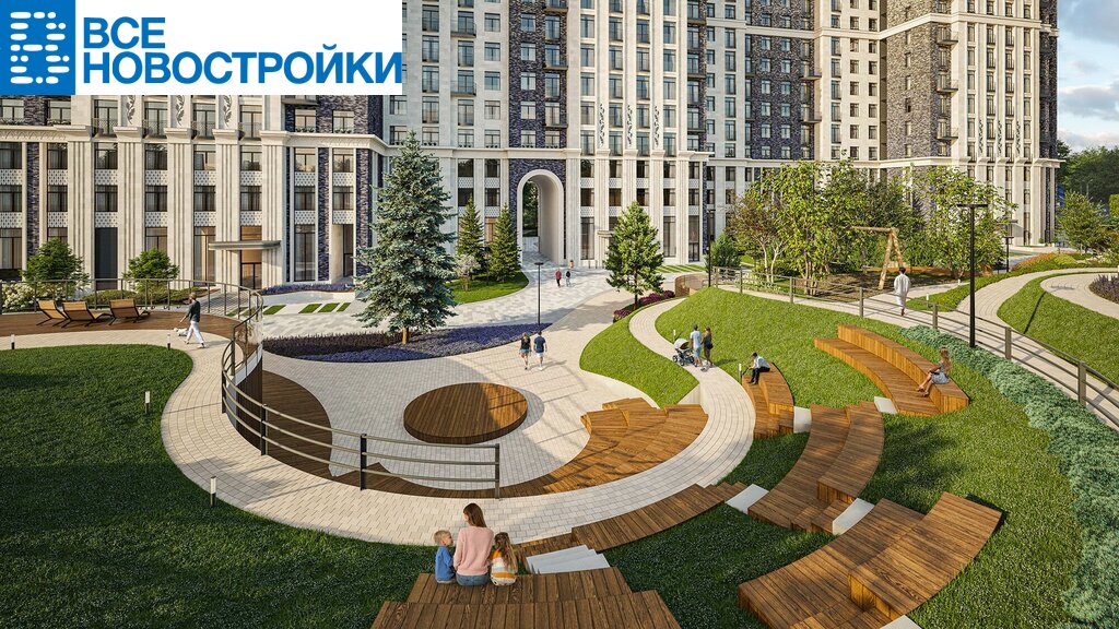 В центральной части двора расположен амфитеатр со сценой для представлений и проведения мероприятий. Для гармоничного развития маленьких жителей — пространства по стандарту Kid`s Lab для гармоничного развития детей всех возрастов: детская площадка, игровая комната, рельефная площадка для общения со сверстниками, где можно заниматься паркуром, танцевать и играть в настольный теннис.