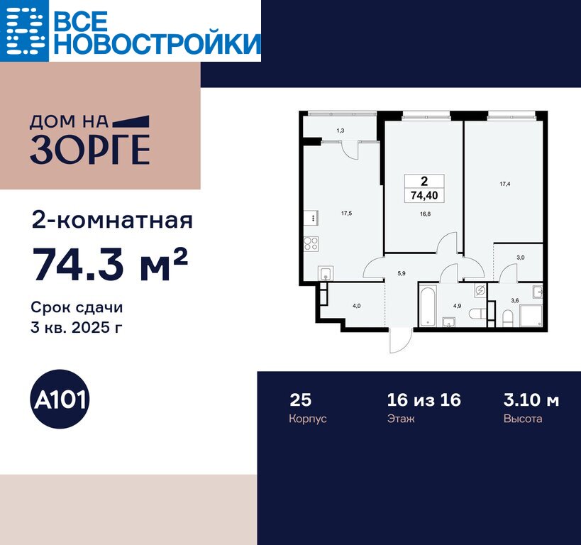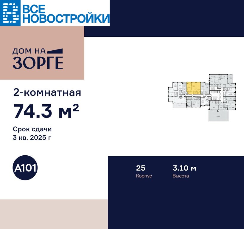Продается двухкомнатная квартира № 190 в новостройке ЖК «Дом на Зорге» по адресу Москва, САО, Сокол, улица Зорге, 25с2, Москва, 125252. Общая площадь квартиры – 74.30 кв. м., этаж 16 из 16, секция 1. Тип проекта, по которому построен дом – монолит, компания-застройщик – ООО «А101». Стоимость квартиры – 34262979 Р. Срок сдачи – 3 квартал 2025.