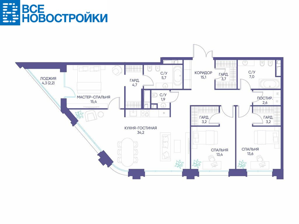 Продается просторная квартира площадью 125.90 м2 в жилом комплексе ДОМ XXII. Квартира находится в 1 секции корпуса 1. Этаж 5-й из 11.