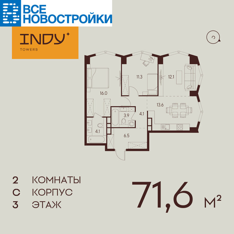 Продается просторная 2-комнатная квартира на 3 этаже жилого комплекса Indy Towers. Вид из окон: во двор. Срок сдачи: 4 кв. 2026 г.
