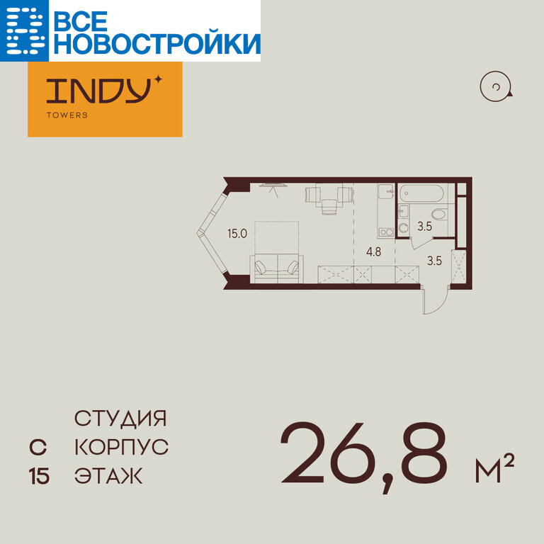 Продается просторная студия на 15 этаже жилого комплекса Indy Towers. Вид из окон: во двор. Срок сдачи: 4 кв. 2026 г.