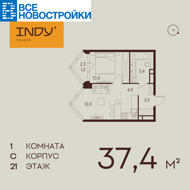 Продается уютная однокомнатная квартира на 21 этаже жилого комплекса Indy Towers. Вид из окон: во двор. Срок сдачи: 4 кв. 2026 г.