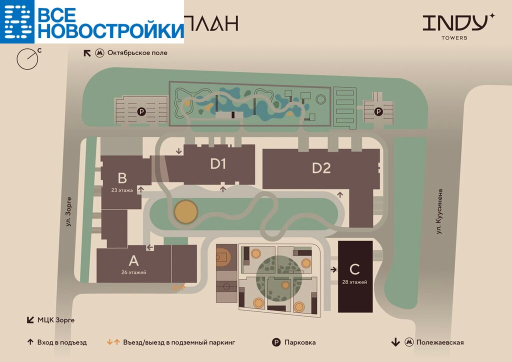 Комплекс расположен в Хорошевском районе Москвы, на улице Куусенина, в окружении почти 150 гектаров парков для прогулок и активного отдыха.
