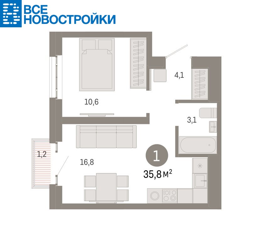 Квартира с кухней-гостиной и одной спальней в квартале «Метроном». Особенности планировки: окна в пол, предчистовая отделка, балкон.