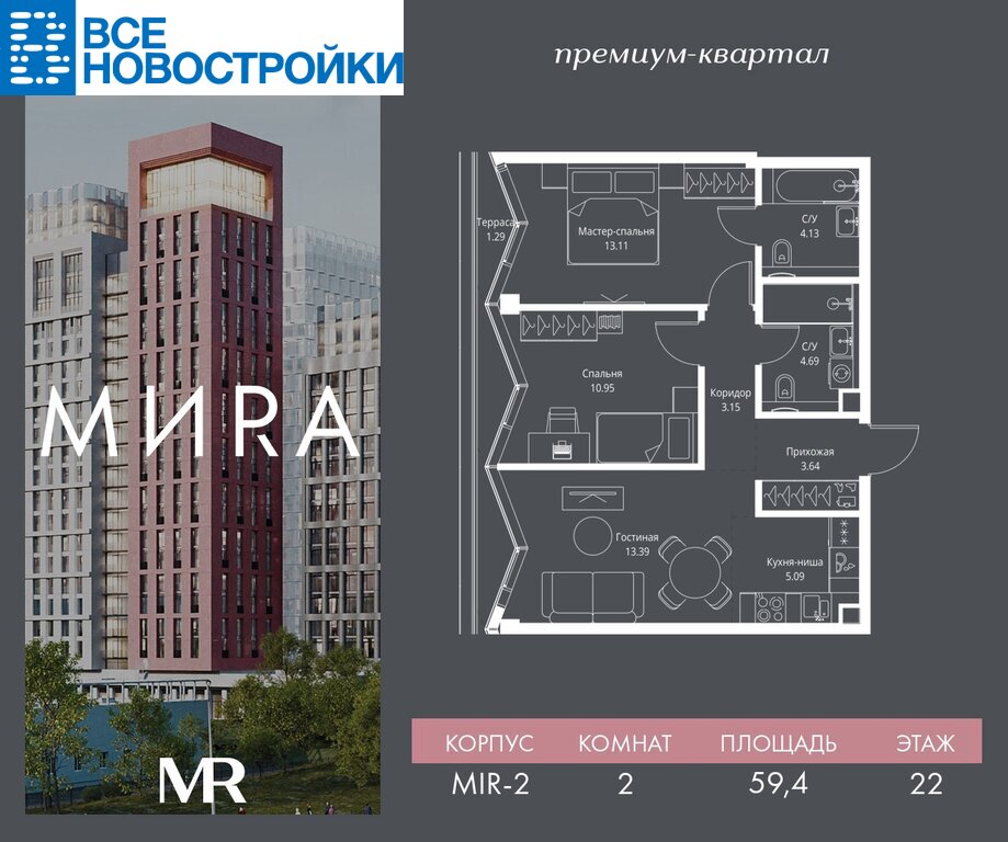 Старт продаж в премиальном жилом квартале МИRА рядом с ВДНХ, в культовой столичной локации, которая играет особую роль в жизни нескольких поколений москвичей. 2-комнатная квартира площадью 59.44 кв.м, расположенная в корпусе MIR-2, на 22 этаже 23 этажного дома.