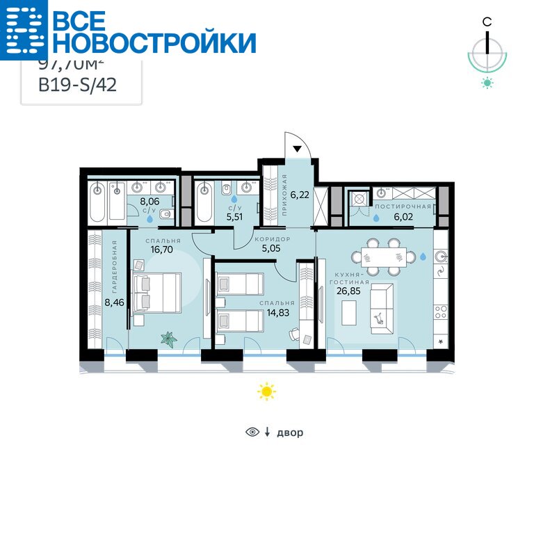 В продаже 2к квартира общей площадью 97,7 кв. м. Квартира расположена на 4 этаже 7-этажной секции клубного дома класса Superb в новом Рублёво-Архангельском районе Москвы, который строит Сбер. Дом находится на первой береговой линии Москвы-реки.
