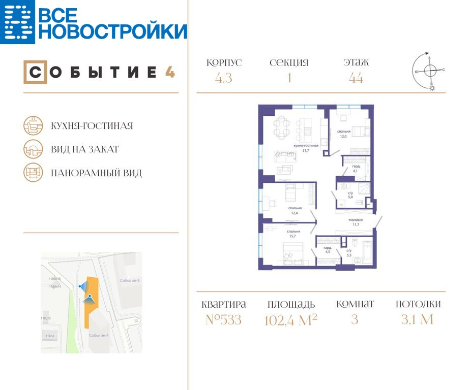Продается 3-комн. квартира в ЖК «Событие» на 44-м этаже. Общая площадь лота составляет 102.40 кв. м, из которых 31.70 кв. м отведено под просторную кухню-гостиную. 2 совмещенных санузла.