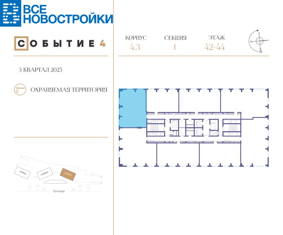 СОБЫТИЕ 4 – единственный в столице жилой небоскреб премиум-класса с парком на высоте 170 м и парящими мостами на уровне 25-27 этажей. Это эксклюзивный для Москвы вертикальный город будущего, в котором на разных уровнях дома, от земли до неба, есть своя инфраструктура для отдыха, спорта и работы. На парящих мостах обустроены лаунжи и коворкинги. На крыше - обзорная площадка, беговая дорожка, воркаут, игровая зона и места тихого отдыха. Из дома открываются потрясающие виды на парки, МГУ, Сити и Поклонную гору.