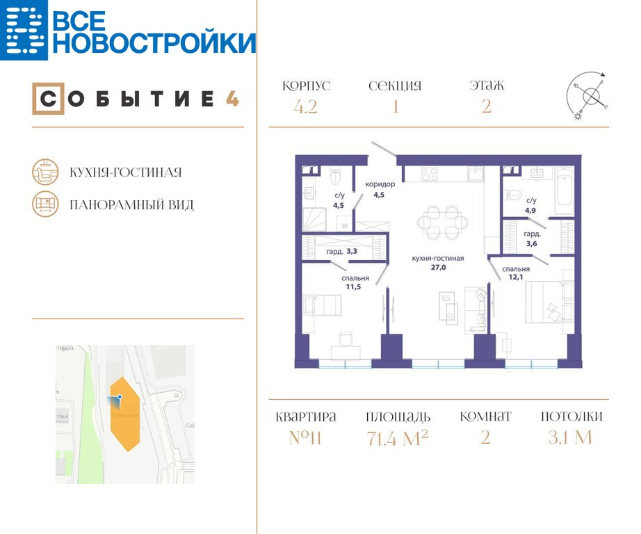 Продается 2-комн. квартира в ЖК «Событие» на 2-м этаже. Общая площадь лота составляет 71.40 кв. м, из которых 27.00 кв. м отведено под просторную кухню-гостиную. 2 совмещенных санузла.