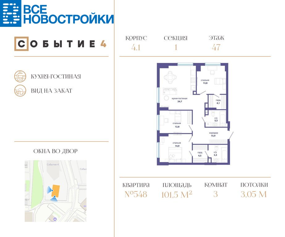 Продается 3-комн. квартира в ЖК «Событие» на 47-м этаже. Общая площадь лота составляет 101.50 кв. м, из которых 24.70 кв. м отведено под просторную кухню-гостиную. 2 совмещенных санузла.