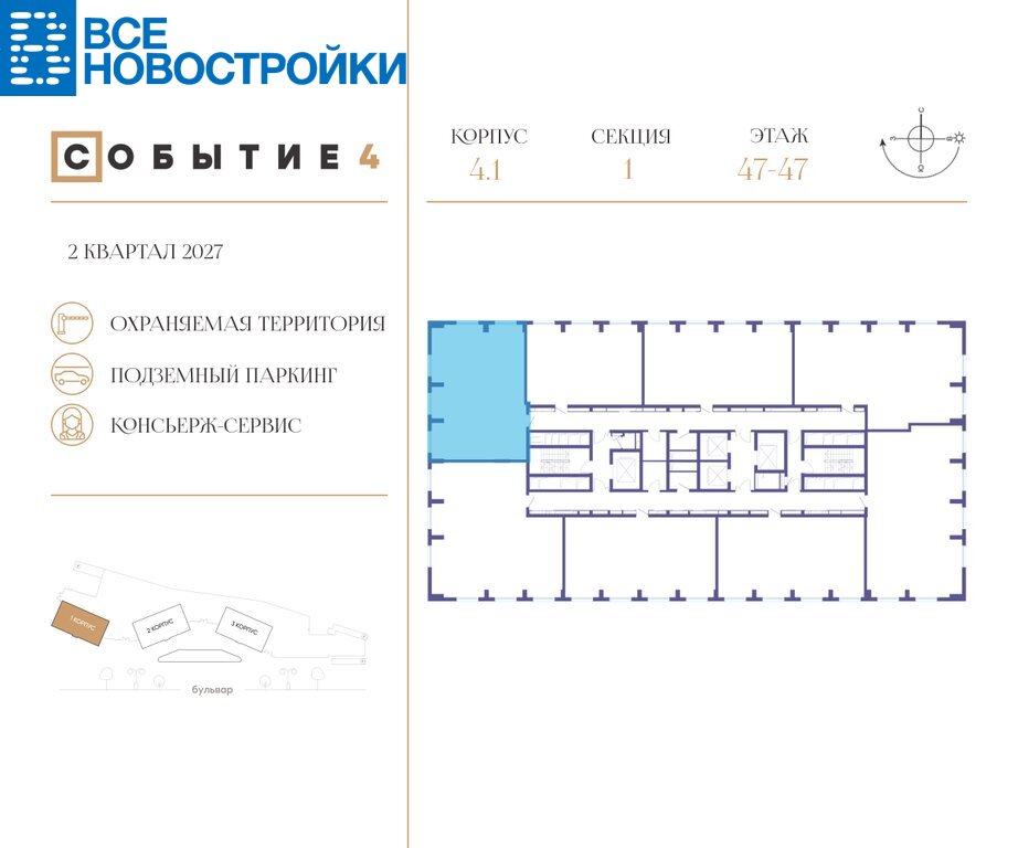 В каждой секции дома – дизайнерское лобби с потолками до 5 м, стильным интерьером, зонах ожидания и лаунжами с мебелью на заказ. Инфраструктура дома включает в себя детские клубы в каждой секции, sky-мосты между секциями на уровне 25 и 27 этажей и уникальный sky-парк на крышах – с обзорной площадкой, беговой дорожкой, воркаутом и местами для отдыха и работы. На мостах устроены зеленые лаунжи и коворкинги. Из дома открываются потрясающие виды на парк ""Событие"", МГУ, Сити, Поклонную гору и запад Москвы.