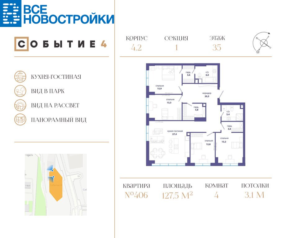 Продается 4-комн. квартира в ЖК «Событие» на 35-м этаже. Общая площадь лота составляет 127.50 кв. м, из которых 27.40 кв. м отведено под просторную кухню-гостиную. 2 совмещенных санузла.