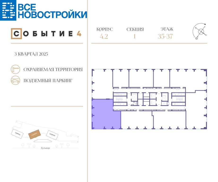 СОБЫТИЕ 4 – единственный в столице жилой небоскреб премиум-класса с парком на высоте 170 м и парящими мостами на уровне 25-27 этажей. Это эксклюзивный для Москвы вертикальный город будущего, в котором на разных уровнях дома, от земли до неба, есть своя инфраструктура для отдыха, спорта и работы. На парящих мостах обустроены лаунжи и коворкинги. На крыше - обзорная площадка, беговая дорожка, воркаут, игровая зона и места тихого отдыха. Из дома открываются потрясающие виды на парки, МГУ, Сити и Поклонную гору.