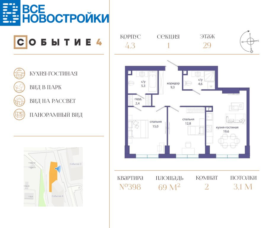 Продается 2-комн. квартира в ЖК «Событие» на 29-м этаже. Общая площадь лота составляет 69.00 кв. м, из которых 19.60 кв. м отведено под просторную кухню-гостиную. 2 совмещенных санузла.