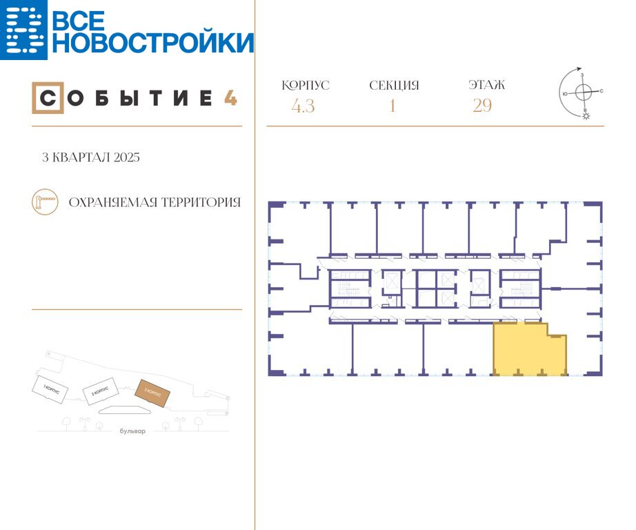 СОБЫТИЕ 4 – единственный в столице жилой небоскреб премиум-класса с парком на высоте 170 м и парящими мостами на уровне 25-27 этажей. Это эксклюзивный для Москвы вертикальный город будущего, в котором на разных уровнях дома, от земли до неба, есть своя инфраструктура для отдыха, спорта и работы. На парящих мостах обустроены лаунжи и коворкинги. На крыше - обзорная площадка, беговая дорожка, воркаут, игровая зона и места тихого отдыха. Из дома открываются потрясающие виды на парки, МГУ, Сити и Поклонную гору.