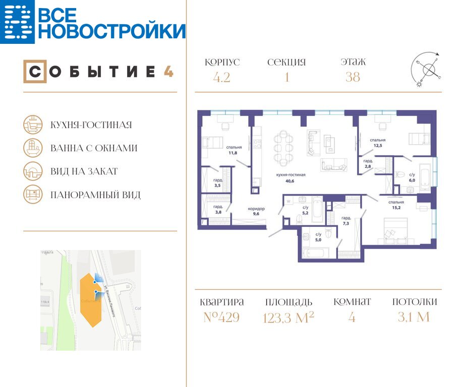 Продается 4-комн. квартира в ЖК «Событие» на 38-м этаже. Общая площадь лота составляет 123.30 кв. м, из которых 40.60 кв. м отведено под просторную кухню-гостиную. 3 совмещенных санузла.
