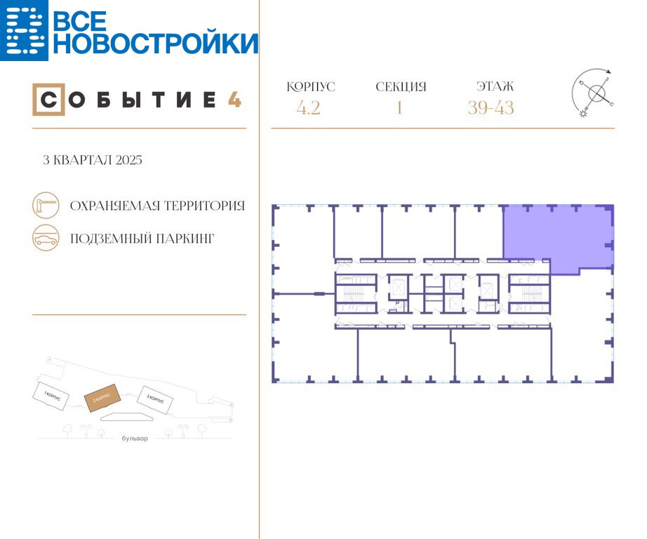 СОБЫТИЕ 4 – единственный в столице жилой небоскреб премиум-класса с парком на высоте 170 м и парящими мостами на уровне 25-27 этажей. Это эксклюзивный для Москвы вертикальный город будущего, в котором на разных уровнях дома, от земли до неба, есть своя инфраструктура для отдыха, спорта и работы. На парящих мостах обустроены лаунжи и коворкинги. На крыше - обзорная площадка, беговая дорожка, воркаут, игровая зона и места тихого отдыха. Из дома открываются потрясающие виды на парки, МГУ, Сити и Поклонную гору.