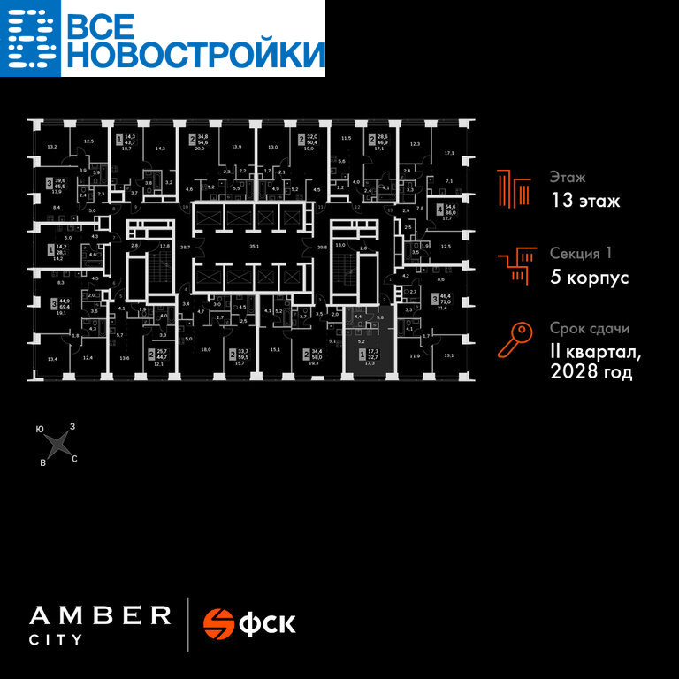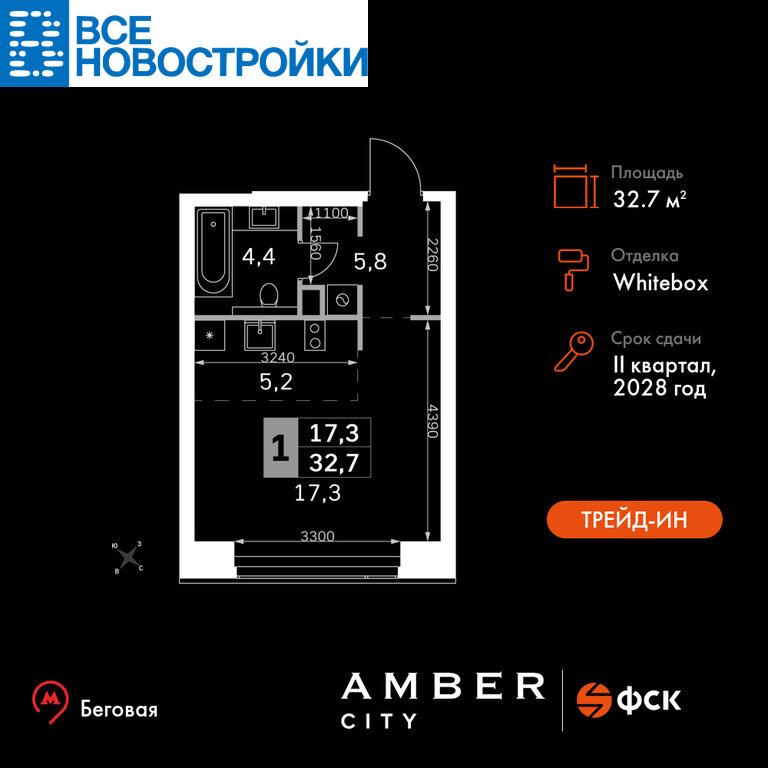 Продаётся 1-к квартира №781 общей площадью 32.7 кв.м. на 13-м этаже 52 этажного дома. Отделка Whitebox.