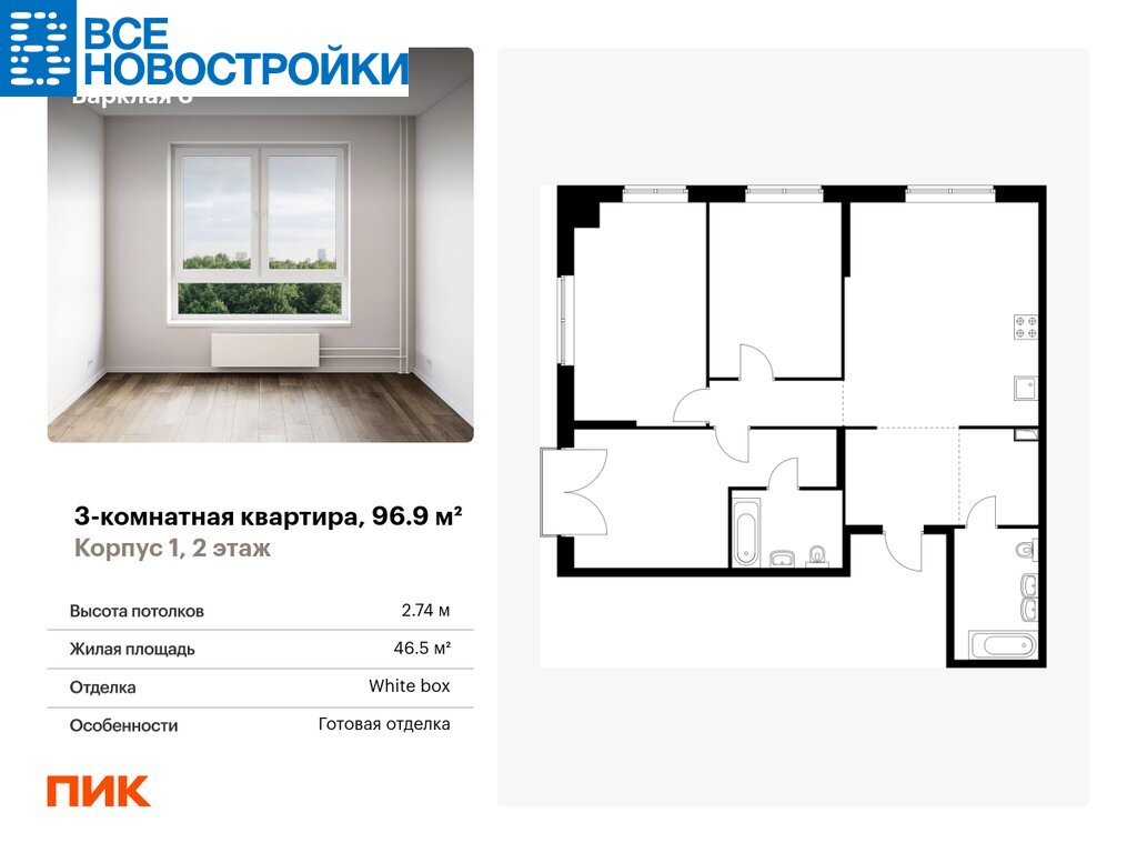 Продаётся 3-комн.квартира площадью 96.90 кв.м на 2 этаже 12 этажного дома (Корпус 1, секция 1) проекта ПИК Барклая 6. Светлый просторный подъезд на уровне земли, функциональная планировка, большие окна, с отделкой.